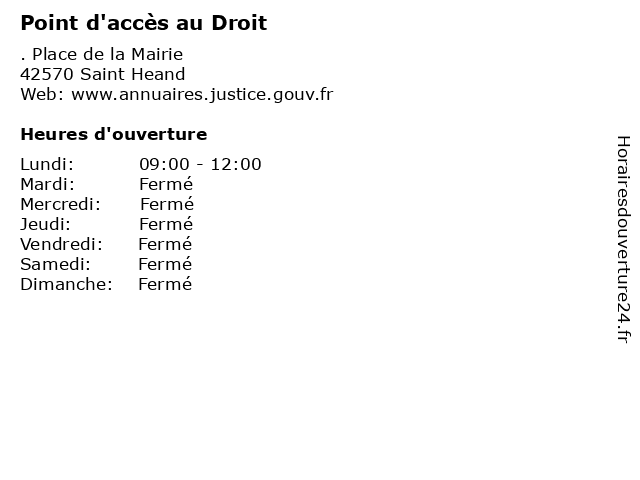 1 Point d'accès au Droit (Distance: 7,01 km) 5 Rue de l'Hôtel de Ville, 42390 Villars au, d'accès, droit, point, public, services 2 Point d'accès au Droit (Distance: 9,70 km) . Place Charles de Gaulle, 42530 Saint Genest Lerpt au, d'accès, droit, point, public, services 3 Point d'accès au Droit (Distance: 10,49 km) . Place de la Mairie, 42650 Saint Jean Bonnefonds au, d'accès, droit, point, public, services 4 Point d'accès au Droit (Distance: 12,34 km) 35 Rue de la République, 42400 Saint Chamond au, d'accès, droit, point, public, services 5 Point d'accès au Droit (Distance: 17,18 km) . Place du Marché, 42700 Firminy au, d'accès, droit, point, public, services 6 Point d'accès au Droit (Distance: 19,30 km) 100 Rue Jean Jaurès, 42800 Rive De Gier au, d'accès, droit, point, public, services |