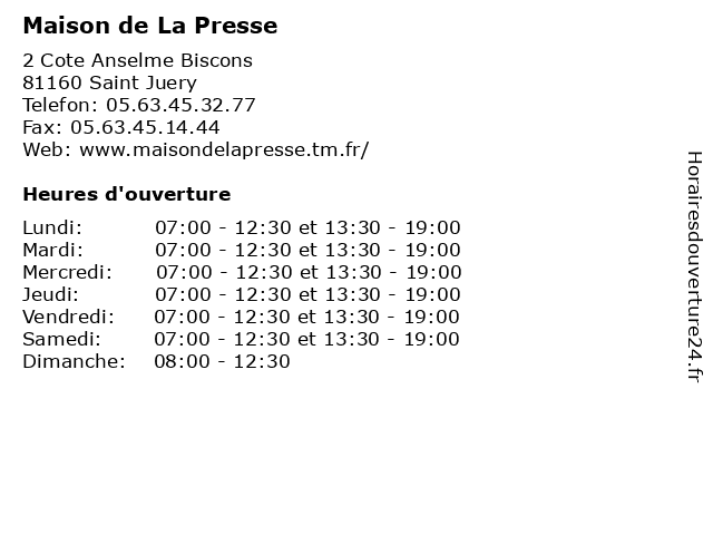 1 Maison de la Presse (Distance: 2,44 km) 2 rue Francois Arago, 81000 Albi de, la, mag, magazine, maison, presse, services 2 Maison de La Presse (Distance: 5,61 km) 91 Dembourg, 81000 Albi cadeaux, carterie, confiserie-boissons-food, de, française des jeux, la, librairie, maison, papeterie, pmu, presse, tabac 3 Maison de la Presse (Distance: 12,00 km) 24 Avenue Jean Jaurès, 81400 Carmaux cadeaux, carterie, confiserie-boissons-food, de, française des jeux, la, librairie, maison, papeterie, pmu, presse, tabac 4 Maison de La Presse (Distance: 19,32 km) 36 Place Louisa Paulin, 81120 Realmont cadeaux, carterie, confiserie-boissons-food, de, française des jeux, la, librairie, maison, papeterie, pmu, presse, tabac 5 Tabac Presse Le Jaurès (Distance: 0,39 km) 61 Avenue Jean Jaurès, 81160 Saint-Juery bar, café, cigarette, fdj, jaurès, journaux, le, presse, tabac 6 Mag Presse (Distance: 1,13 km) - Route de Carmaux, 81380 Lescure-d'Albigeois mag, magazine, presse, services |