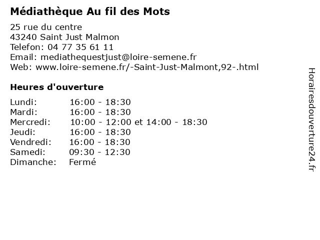 | Mercredi | 10:00-12:00 et 14:00-18:30 |