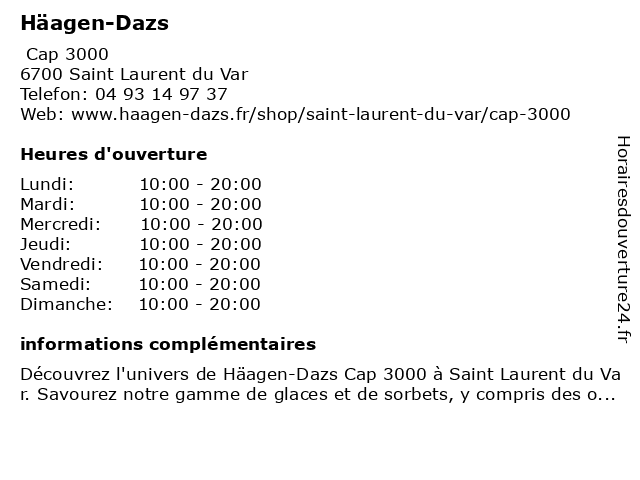 1 Häagen-Dazs (Distance: 5,82 km) Centre Commercial Polygone Riviera, 06800 Cagnes-sur-Mer boutique de desserts, café, dazs, häagen 4 Häagen-Dazs (Distance: 7,58 km) 604 Route De Grenoble, 06200 Nice boutique de desserts, café, dazs, häagen 6 |