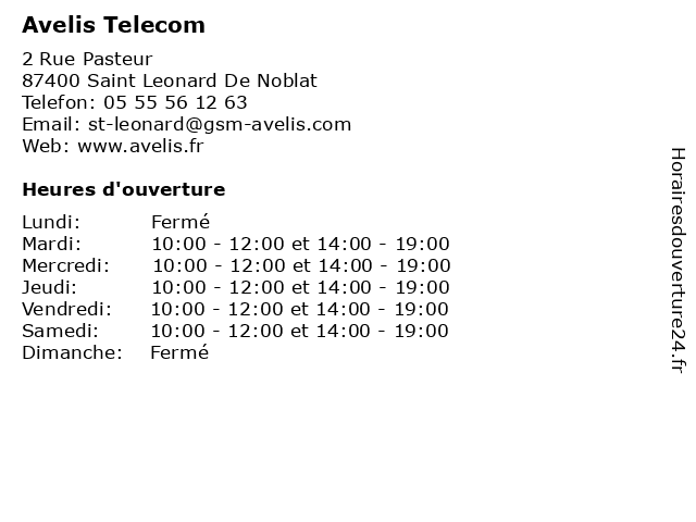 1 Avelis Telecom (Distance: 16,62 km) 38 Avenue Casseaux, 87000 Limoges avelis, electromenager, smartphone, telecom 2 Coriolis Telecom (Distance: 0,46 km) 7 rue de la Libération, 87400 Saint-Léonard-de-Noblat boutique, coriolis, forfait, magasin, portables, telecom, téléphone, téléphonie 3 BOUYGUES TELECOM (Distance: 15,65 km) Route de Toulouse, 87220 Boisseuil bouygues, fai, fournisseur d'accès internet, telecom, téléphonie mobile 5 Coriolis Telecom (Distance: 16,19 km) s/n Place Beaubreuil, 87280 Limoges coriolis, mobiles, services, telecom, téléphones 6 BOUYGUES TELECOM (Distance: 18,03 km) 39 BIS AVENUE GARIBALDI, 87000 Limoges bouygues, fai, fournisseur d'accès internet, telecom, téléphonie mobile |