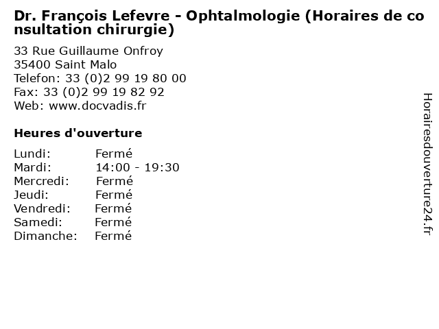 Termes de recherche pour Dr. François Lefevre - Ophtalmologie (Horaires de consultation chirurgie):de, francois, horaires, santé, lefevre, chirurgie, docteur, dr., médecins, consultation, ophtalmologie |