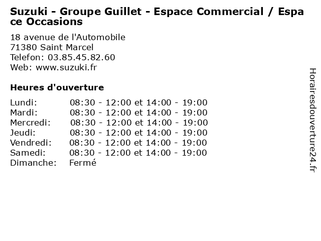 1 Suzuki - Groupe Guillet - Service Après-Vente (Distance: 0,00 km) 18 avenue de l'Automobile, 71380 Saint Marcel après, auto, auto dealer, car, groupe, guillet, parts, service, services, suzuki, vente 2 Suzuki - Groupe Guillet - Magasin (Distance: 0,00 km) 18 avenue de l'Automobile, 71380 Saint Marcel auto, auto dealer, car, groupe, guillet, magasin, parts, services, suzuki 3 Mitsubishi - Hall de l'automobile - Groupe Guillet Automobiles (Distance: 0,00 km) 18 avenue de l'automobile, 71380 Saint-Marcel automobiles, de, groupe, guillet, hall, l'automobile, mitsubishi 4 Chalon Automobiles - Groupe Guillet (Distance: 0,52 km) 1 Avenue de l'Automobile, 71100 Chalon sur Saône automobile, automobiles, chalon, concessionnaire, entretien, groupe, guillet, neuve, occasion, réparation, vente 5 Fogex - André le Groupe (Distance: 1,06 km) 3 Avenue de Chalon, 71380 Saint-Marcel andré, andré le groupe, comptable, fogex, groupe, le, saint-marcel 6 SDME Connect - Groupe Sonepar (Distance: 4,12 km) 1 Rue de la Guerlande, 71880 Châtenoy-le-Royal bâtiment, connect, construction, groupe, installations, sdme, services, sonepar, électricité |
