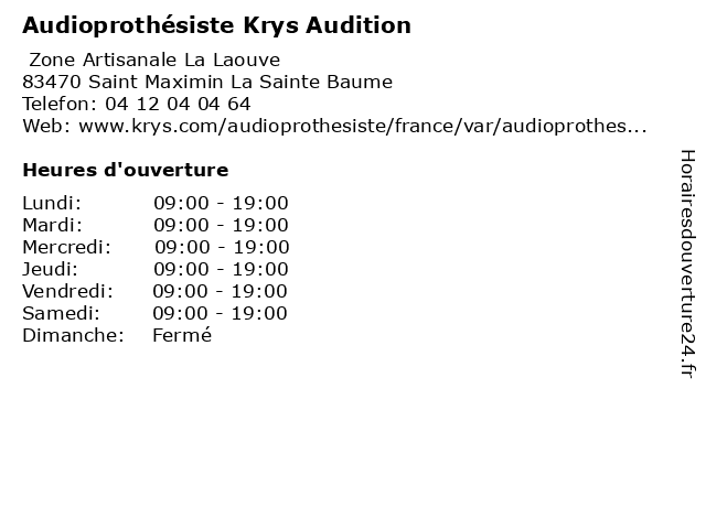 1 Audioprothésiste Krys Audition (Distance: 16,10 km) 45 Avenue Saint, 83170 Brignoles audiologie, audioprothésiste, audition, krys 2 Opticien Krys (Distance: 0,00 km) Za La Laouve, 83470 Saint Maximin La Sainte Baume krys, magasin de lentilles correctrices, magasin de lunettes de soleil, magasin d’accessoires de mode, opticien, optométrie 3 ACUITIS Opticien & Audioprothésiste Saint-Maximin-La-Sainte-Baume (Distance: 0,21 km) Rue du Coudoulet, 83470 Saint-Maximin-la-Sainte-Baume acuitis, audiologiste, audioprothesiste, audioprothésiste, baume, la, magasin d'appareils auditifs, magasin de lentilles de contact, magasin de lunettes de soleil, maximin, opticien, optometrie, saint, sainte 4 Audika - Audioprothésiste Saint-Maximin (Distance: 0,21 km) Z.A. la Laouve, 83470 Saint-Maximin-la-Sainte-Baume appareil auditif, audika, audiologiste, audioprothésiste, centre auditif, maximin, saint, spécialiste audition 5 Audioprothésiste Saint-Maximin - Audika (Distance: 0,22 km) Rue du Coudoulet, 83470 Saint-Maximin-la-Sainte-Baume audika, audioprothésiste, maximin, saint 6 Audition Conseil (Distance: 0,61 km) 32 Rue Gutenberg, 83470 Saint-Maximin-la-Sainte-Baume audition, conseil |