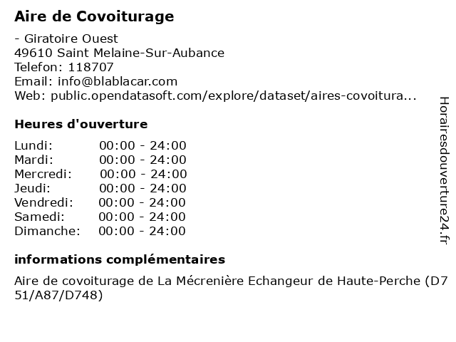 | 1 Aire de Covoiturage (Distance: 3,25 km) - Giratoire D123/D160, 49610 Mozé-Sur-Louet aire, covoiturage, de, partager, trajets 2 Aire de Covoiturage (Distance: 3,36 km) - Echangeur de Haute-Perche (D751/A87/D748), 49280 Saint Melaine-Sur-Aubance aire, covoiturage, de, partager, trajets 3 Aire de Covoiturage (Distance: 3,65 km) - Echangeur de Haute-Perche (D751/A87/D748) - Giratoire Est, 49610 Sainte Melaine-Sur-Aubance aire, covoiturage, de, partager, trajets 4 Aire de Covoiturage (Distance: 7,46 km) - Giratoire carré D952 / Rue Ligérienne, 49800 Loire-Authion aire, covoiturage, de, partager, trajets 5 Aire de Covoiturage (Distance: 12,38 km) - Parking derrière station de lavage Super U, 49800 Loire-Authion aire, covoiturage, de, partager, trajets 6 Aire de Covoiturage (Distance: 12,68 km) - Giratoire échangeur D102E/D523, 49070 Beaucouzé aire, covoiturage, de, partager, trajets |
