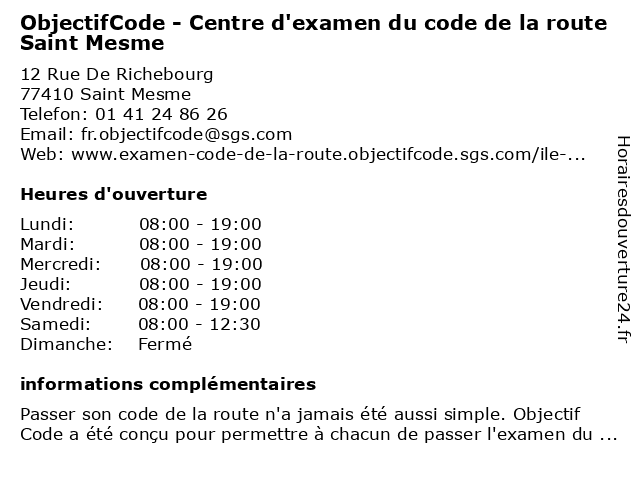 1 ObjectifCode - Centre d'examen du code de la route Villeroy (Distance: 2,18 km) 2 Rue Saint Pierre, 77410 Villeroy centre, code, d'examen, de, du, la, objectifcode, route, villeroy 2 ObjectifCode - Centre d'examen du code de la route Fresnes sur Marne (Distance: 3,73 km) 2 Rue De L Eglise, 77410 Fresnes sur Marne centre, code, d'examen, de, du, fresnes, la, marne, objectifcode, route, sur 3 ObjectifCode - Centre d'examen du code de la route Messy (Distance: 4,33 km) 10 Grande Rue, 77410 Messy centre, code, d'examen, de, du, la, messy, objectifcode, route 4 ObjectifCode - Centre d'examen du code de la route Precy sur Marne (Distance: 4,56 km) 2 Chemin Des Noyers, 77410 Precy sur Marne centre, code, d'examen, de, du, la, marne, objectifcode, precy, route, sur 5 ObjectifCode - Centre d'examen du code de la route Montge en Goele (Distance: 6,52 km) 11 Rue De La Loi, 77230 Montge en Goele centre, code, d'examen, de, du, en, goele, la, montge, objectifcode, route 6 Centre d’examen du code de la route - DEKRA (Distance: 6,99 km) 6 Rue Ernest Sarron, 77410 CLAYE-SOUILLY centre, code, cours, de, dekra, du, d’examen, examens, formation, la, permis, route |