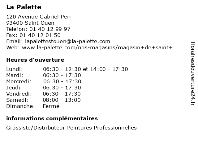 1 La Palette (Distance: 0,99 km) 120 Avenue Gabriel Peri, 93400 Saint- Ouen enduit, fournitures, la, magasin, matériel, palette, peintures 2 La Palette (Distance: 1,79 km) 52 boulevard Jean Jaurès, 92110 Clichy distributeur, grossiste, la, palette, peinture 3 La Palette (Distance: 2,51 km) 55 Rue Jean Jaurès, 92300 Levallois Perret enduit, fournitures, la, magasin, matériel, palette, peintures 4 La Palette (Distance: 2,98 km) 55 Rue Jean-Jaurès, 92300 Levallois Perret distributeur, grossiste, la, palette, peinture 5 La Palette (Distance: 4,43 km) 41 boulevard Georges Clemenceau, 92400 Courbevoie distributeur, grossiste, la, palette, peinture 6 La Palette (Distance: 6,52 km) 20 Rue Charenton, 75012 Paris la, materiel, palette, revetement, services |