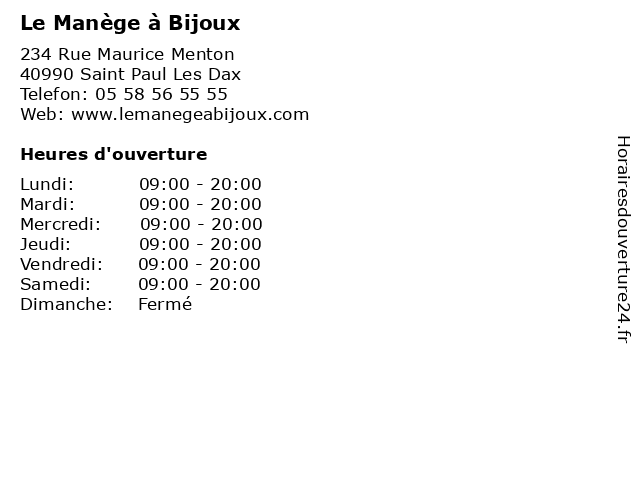 1 Le Manège à Bijoux (Distance: 0,04 km) 234 Rue Maurice Menton, 40990 Saint-Paul-lès-Dax bijoux, le, manège 3 Le Manège à Bijoux® (Distance: 2,45 km) . Rue Croix Blanche, 40100 Dax alliances, bangues, bijoux®, boucles, chaines, le, manège, mode 4 Histoire d'Or (Distance: 2,43 km) Boulevard Des Sports, 40100 Dax bijoutier, création de bijoux, d'or, gravures sur bijoux, histoire, magasin de montres, négociant en or, réparation de bijoux, réparation de montres 5 Le Manège à Bijoux (Distance: 22,41 km) . Route Nationale 10, 40230 Saint Vincent De Tyrosse bijoux, le, manège, montres. 6 Le Manège Enchanté (Distance: 27,36 km) - Route de Tyrosse, 40150 Angresse centre équestre, cheval, chevaux, enchanté, le, manège, équitation |