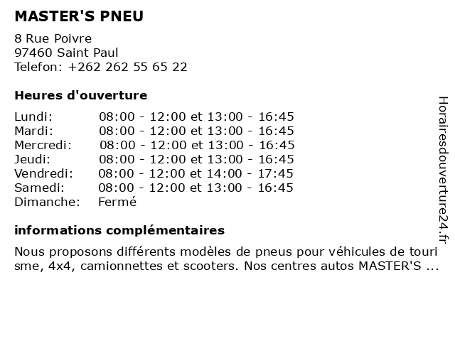 1 Master's Pneu (Distance: 6,12 km) 8 rue Poivre, 97460 Saint Paul auto, centre, filtre, freinage, huile, installation, master's, pneu, pneus, révision, vente, vidange, voiture, véhicule 2 REP - L'Expert du Pneu (Distance: 1,90 km) 267 Chaussée Royale, 97460 Saint-Paul amortisseur, automobile, du, entretien, garage, l'expert, pneu, pneus, rep, vidange 3 PneusGom - Pneu Pas Cher (Distance: 2,06 km) 275 Chaussée Royale, 97490 Saint-Paul amortisseur, automobile, cher, entretien, garage, pas, pneu, pneus, pneusgom, vidange 4 REP - L'Expert du Pneu (Distance: 8,60 km) - rue Charles Darwin, 97426 Le Port amortisseur, automobile, du, entretien, garage, l'expert, pneu, pneus, rep, vidange 5 REP - L'Expert du Pneu (Distance: 17,05 km) 65 rue Général Lambert, 97436 Saint-Leu amortisseur, automobile, du, entretien, garage, l'expert, pneu, pneus, rep, vidange 6 Autocomptoir Pneu (Distance: 17,38 km) 13 rue de la Salette, 97436 Saint-Leu amortisseur, autocomptoir, automobile, entretien, garage, pneu, pneus, vidange |