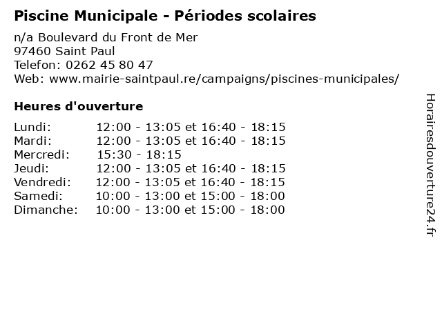 1 Piscine Municipale - Périodes scolaires (Distance: 5,32 km) 26 Chemin de la Piscine, 97411 Bois de Nèfles bassins, municipale, piscine, piscines, périodes, scolaires, sports 2 Piscine Municipale - Vacances Scolaires (Distance: 0,00 km) n/a Boulevard du Front de Mer, 97460 Saint Paul bassins, municipale, piscine, piscines, scolaires, sports, vacances 3 Trésorerie municipale de Saint-Paul (Distance: 1,15 km) 4 rue Suffren, 97460 Saint-Paul de, et, hôpitaux, municipale, paul, public, saint, saint-paul, trésor, trésorerie 4 Centre Nautique Josselyn-Flahaut - Vacances scolaires (Distance: 2,15 km) 57 rue Gabriel Guist’hau, 97460 Saint Paul bassins, centre, flahaut, josselyn, nautique, piscine, piscines, scolaires, sports, vacances 5 Centre Nautique Josselyn-Flahaut - Périodes scolaires (Distance: 2,56 km) 57 rue Gabriel Guist’hau Plateau Caillou, 97460 Saint Paul bassins, centre, flahaut, josselyn, nautique, piscine, piscines, périodes, scolaires, sports 6 Piscine Municipale - Vacances Scolaires (Distance: 5,32 km) 26 Chemin de la Piscine, 97411 Bois de Nèfles bassins, municipale, piscine, piscines, scolaires, sports, vacances |