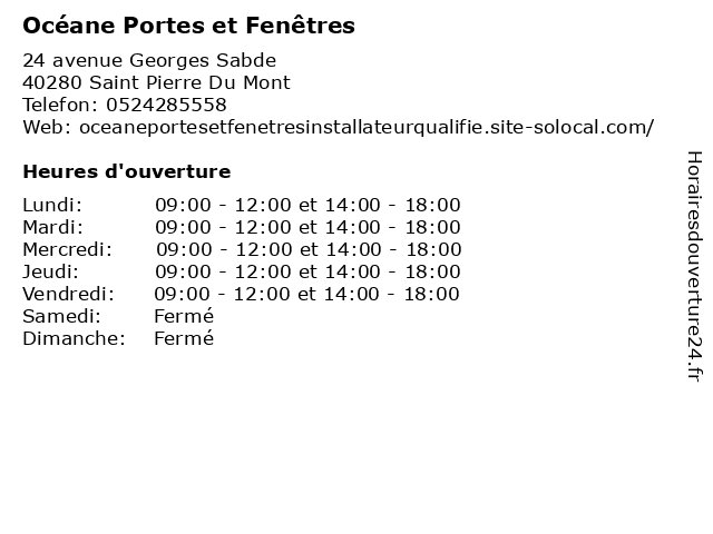 1 Fenetre Océane (Distance: 0,01 km) 24 Avenue Georges Sabde, 40280 Saint-Pierre-du-Mont fenetre, fenêtre, maison, océane, services 2 PORTES ET FENÊTRES (Distance: 2,06 km) 469 Avenue Georges Clemenceau, 40000 Mont-de-Marsan et, fenêtres, portes 3 Entreprise Portes-Espaignet SAS (Distance: 5,12 km) 68 Rue de Courthabilat, 40000 Mont-de-Marsan entreprise, espaignet, portes, sas 4 Tryba Fenetres (Distance: 1,64 km) 9 Place Jean Jaurès, 40000 Mont De Marsan fenetres, fenêtres, portes, tryba, volets 5 Monsieur Store (Distance: 3,85 km) 2 Avenue de Chourié, 40000 Mont-de-Marsan fenetres, monsieur, pergolas, portails, portes, portes de garage, store, volets 6 Komilfo (Distance: 46,46 km) 171 Avenue Saint Vincent de Paul, 40100 Dax equipement de la maison, komilfo, portes - fenêtres |
