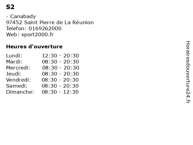 2 S2 Sneakers Specialist (Distance: 0,84 km) 64 Rue des Bons Enfants, 97410 Saint-Pierre boutique, chaussures, marque, prêt à porter, s2, sneakers, specialist 3 Sport 2000 (Distance: 0,73 km) 64 Rue des Bons Enfants, 97410 Saint Pierre de La Réunion 2000, course à pied, mode, multisport, sport 4 Sport 2000 (Distance: 2,57 km) 16 Rue de la Poudrière, 97410 Saint Pierre de La Réunion 2000, course à pied, mode, multisport, sport 6 Sport 2000 (Distance: 48,31 km) - Rue Michel Ange, 97400 Sainte Marie de la Reunion 2000, course à pied, mode, montagne, multisport, sport |