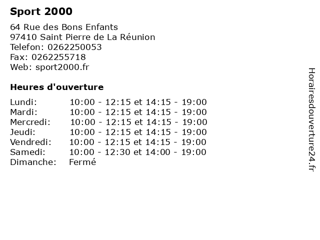 1 Sport 2000 (Distance: 2,46 km) 16 Rue de la Poudrière, 97410 Saint Pierre de La Réunion 2000, course à pied, mode, multisport, sport 2 Moderny's Sport (Distance: 0,30 km) 29 rue des Bons Enfants, 97410 Saint-Pierre accessoires, habillement, mode, moderny's, sport, vetements 3 RS Sport (Distance: 0,50 km) 49 Rue Victor le vigoureux, 97410 Saint-pierre 974, automobile, jantes, pièces, rallye, rs, sport 4 Moto 2000 (Distance: 0,97 km) 16 Rue Luc Lorion, 97410 Saint-Pierre 2000, atelier, concessionnaire, moto, vente 5 Optic 2000 - Opticien Saint-Pierre (Distance: 1,28 km) 182 Rue Marius et Ary Leblond, 97410 Saint-Pierre 2000, lentilles de contact, lunettes de soleil, lunettes de vue, optic, optic2000, opticien, opticien optic2000, pierre, ray-ban, rayban, saint 6 Moderny's Sport (Distance: 7,75 km) 89 rue Hubert Delisle, 97430 Le Tampon accessoires, habillement, mode, moderny's, sport, vetements |