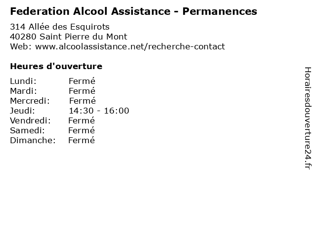 1 Federation Alcool Assistance - Permanences (Distance: 0,00 km) 314 Allée des Esquirots, 40280 Saint Pierre du Mont alcool, assistance, federation, permanences, public, services 2 Federation Alcool Assistance - le 4ème dimanche (Distance: 0,00 km) 314 Allée des Esquirots, 40280 Saint Pierre du Mont 4ème, alcool, assistance, dimanche, federation, le, publics, services 3 Federation Alcool Assistance - Permanence à DAX (Distance: 0,00 km) 314 Allée des Esquirots, 40280 Saint Pierre du Mont alcool, assistance, dax, federation, permanence, publics, services 4 Federation Alcool Assistance - 1er et 3ème samedi (Distance: 1,94 km) 6 Rue du 8 Mai 1945, 40000 Mont de Marsan 1er, 3ème, alcool, assistance, et, federation, public, samedi, services 5 Matériel Médical Assistance (Distance: 3,02 km) 780 Avenue du Maréchal Foch, 40000 Mont-de-Marsan assistance, matériel, médical 6 Cave Lou Barricot (Distance: 30,04 km) 26 rue Gambetta, 40800 Aire-sur-l'Adour alcool, barricot, blancs, cave, caviste, lou, rosés, rouges, spiritueux, vin |