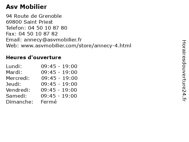 1 Asv Mobilier (Distance: 12,29 km) 28 cours Lafayette, 69003 Lyon asv, deco, design, magasins, mobilier 2 Asv Mobilier (Distance: 13,71 km) 46 quai Saint Vincent, 69001 Lyon asv, deco, design, magasins, mobilier 4 Mobilier de France (Distance: 0,81 km) 53 Route de Grenoble, 69800 Saint-Priest canapé, chambre, de, design, france, haut de gamme, meubles, mobilier, salle à manger, salon, sur-mesure 6 CMM Composants Mobilier Métallique (Distance: 8,31 km) 4 Rue Francine Fromont, 69120 Vaulx-en-Velin cmm, composants, mobilier, métallique |