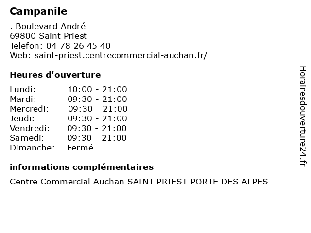 1 Campanile Restaurant (Distance: 16,88 km) n/a Za Hoteliere Commercial, 26740 Les Tourrettes campanile, hotel, petit dejeuner, restaurant 2 Hôtel Campanile (Distance: 16,89 km) n/a Za Hoteliere Les Tourrettes, 26740 Les Tourrettes bar, campanile, hotel, hôtel, restaurant, réunions, évenements 3 Amarine (Distance: 0,00 km) . Boulevard André, 69800 Saint Priest amarine, beaute, boutiques, brasserie, cache, chaussures, concorde, deco, enfants, le, mode femme, mode hommes, optique, restaurant, sport 4 Andre (Distance: 0,00 km) . Boulevard André, 69800 Saint Priest andre, beaute, boutiques, brasserie, cache, chaussures, concorde, deco, enfants, le, mode femme, mode hommes, optique, restaurant, sport 5 Aubert (Distance: 0,00 km) . Boulevard André, 69800 Saint Priest aubert, beaute, boutiques, brasserie, cache, chaussures, concorde, deco, enfants, le, mode femme, mode hommes, optique, restaurant, sport 6 Auchan (Distance: 0,00 km) . Boulevard André, 69800 Saint Priest auchan, beaute, boutiques, brasserie, cache, chaussures, concorde, deco, enfants, le, mode femme, mode hommes, optique, restaurant, sport |