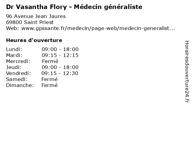 1 Dr Vasantha Chevally-Billaudaz - Médecin généraliste (Distance: 1,24 km) 2 Place Paul Cézanne, 69800 Saint-Priest billaudaz, chevally, docteur, dr, generaliste, généraliste, medical, médecin, soin, vasantha 2 Michele Flory - Hypnothérapeute (Distance: 23,21 km) 143 Rue du Falque, 69380 Dommartin flory, hypno, hypnose, hypnothérapeute, michele, sante 3 Aude FLORY Tapissier Créateur des Marais (Distance: 36,76 km) 23 Rue Roland, 69400 Villefranche-sur-Saône aude, créateur, des, flory, marais, tapissier 4 Dr Véronique Arnaud - Médecin généraliste (Distance: 0,00 km) 96 Avenue Jean Jaures, 69800 Saint Priest arnaud, docteur, dr, généraliste, médecin, santé, véronique 5 Dr Marie-Laure Paquet - Médecin généraliste (Distance: 0,00 km) 96 Avenue Jean Jaures, 69800 Saint Priest docteur, dr, généraliste, laure, marie, médecin, paquet, santé 6 Dr Karine Chopard Fernandez - Médecin généraliste (Distance: 0,29 km) 21 Boulevard Edouard Herriot, 69800 Saint-Priest chopard, consultation, docteur, dr, fernandez, générale, généraliste, karine, medecins, médecin, médecine, rendez, santé, sur, vous |