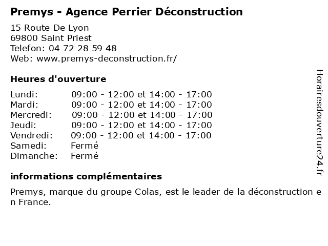 1 Premys Déconstruction (Distance: 0,06 km) 15 Route de Lyon, 69800 Saint-Priest béton, colas, déconstruction, découpe, premys, public, travaux, établissement 2 Pharmacie Perrier (Distance: 3,64 km) 159 Avenue Franklin Roosevelt, 69500 Bron herboristerie, médicaments, paramédical, parapharmacie, perrier, pharmacie, pharmacien, santé, traitements 3 Perrier Constructeur (Distance: 6,50 km) 55 Rue Paul et Marc Barbezat, 69150 Décines-Charpieu charpentes, constructeur, décines-charpieu, menuiserie, métallerie, perrier 5 Maître Yannick Perrier - Avocat (Distance: 8,55 km) 136 cours Lafayette, 69003 Lyon avocat, avocats, cabinet, conseils, contentieux, juridique, justice, litiges, maître, perrier, services, yannick 6 Boucherie Centrale Giroud & Perrier (Distance: 8,68 km) 102 Cours lafayette, 69003 Lyon alimentaire, alimentation, boucher, boucherie, centrale, charcuterie, charcutier, giroud, perrier, traiteur, viande, viandes, épicerie |