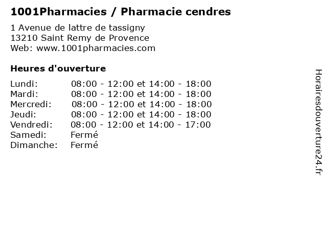 1 Aprium Pharmacie Cendres (Distance: 0,11 km) 1 Avenue Mal de Lattre de Tassigny, 13210 Saint-Rémy-de-Provence aprium, cendres, pharmacie 2 1001Pharmacies / Pharmacie Lambert (Distance: 10,54 km) 5 Place jean jaures, 13550 Noves 1001pharmacies, la médecine, la pharmacie, la santé, lambert, les soins, pharmacie 3 1001Pharmacies / Pharmacie Saint Pierre (Distance: 12,08 km) 1 - 3 Rue la Libération, 13870 Rognonas 1001pharmacies, la médecine, la pharmacie, la santé, les soins, pharmacie, pierre, saint 4 1001Pharmacies / Grande pharmacie Cavaillonnaise (Distance: 17,43 km) 38 Avenue René Coty, 84300 Cavaillon 1001pharmacies, cavaillonnaise, grande, la médecine, la pharmacie, la santé, les soins, pharmacie 5 1001Pharmacies / Société Karinature (Distance: 18,42 km) 30 Rue du Rigaudon, 84130 Le Pontet 1001pharmacies, karinature, la médecine, la pharmacie, la santé, les soins, pharmacie, société 6 1001Pharmacies / Société Innovelia-distribution (Distance: 28,27 km) 45 Traverse de l'Audifrette, 84210 Pernes-les-Fontaines 1001pharmacies, distribution, innovelia, la médecine, la pharmacie, la santé, les soins, pharmacie, société |