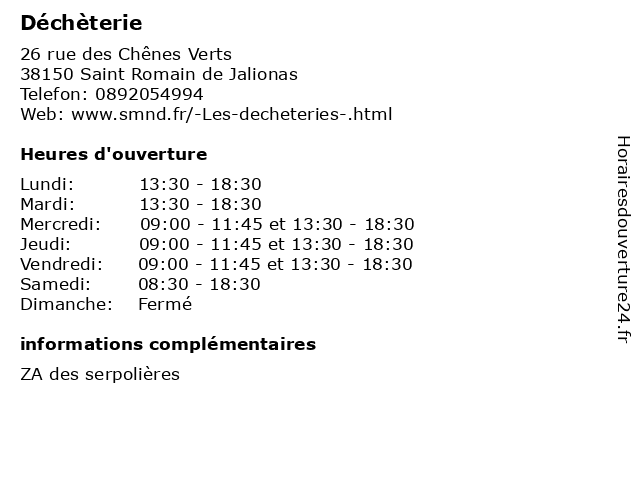 1 Déchèterie (Distance: 5,42 km) - Route Port Galland, 01360 Loyettes déchèterie, gravats, huiles usées, la réception des déchets et écocentres, les appareils électroménagers, les déchets verts, papier et carton en quantité 2 Déchèterie (Distance: 7,19 km) - Route de loyettes, 01150 Saint-Vulbas déchèterie, gravats, huiles usées, la réception des déchets et écocentres, les appareils électroménagers, les déchets verts, papier et carton en quantité 3 Déchèterie (Distance: 7,24 km) 10 Chemin des Brosses, 69124 Colombier-Saugnieu collecte, déchets, déchèterie, détritus, gravats, tri 4 Déchèterie (Distance: 9,31 km) - Rue Philippe Tassier, 38460 Optevoz collecte, déchets, déchèterie, détritus, gravats, tri 5 Déchèterie (Distance: 9,61 km) 91 chemin des Fuziers, 38460 Panossas déchèterie, gravats, huiles usées, la réception des déchets et écocentres, les appareils électroménagers, les déchets verts, papier et carton en quantité 6 Déchèterie (Distance: 12,30 km) - route nationale 36, 38290 Satolas-et-Bonce collecte, déchets, déchèterie, détritus, gravats, tri |