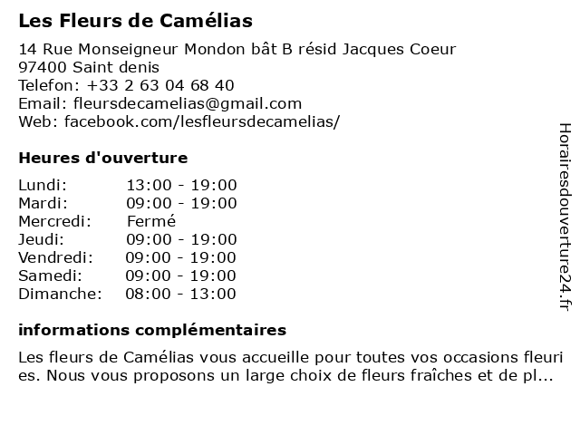1 La Poste - Saint-Denis Réunion Camélias (Distance: 0,14 km) 4 Avenue des Cocotiers, 97400 Saint-Denis bureau de poste, camélias, chronopost, colis, courrier, denis, dps, expéditions internationales, la, point, postale, poste, relais, réunion, saint, timbres, téléphonie, ups, western union 2 ANSET Assurances des Camélias (Distance: 0,34 km) 9 Boulevard Doret, 97400 Saint-Denis agence, anset, assurance, assurances, camélias, conseils, courtier, des, protections 3 SEMA FLEURS Saint-Denis (Distance: 1,50 km) 46bis allée des Topazes, 97400 Saint-Denis 97400, belle pierre, denis, décoratrice événementiels saint denis, fleur baptême saint denis, fleuriste belle pierre, fleuriste mariage saint denis, fleuriste saint denis, fleurs, fleurs anniversaire saint denis, fleurs mariage saint denis, saint, sema, vente plantes belle pierre 5 Au Pays des Fleurs (Distance: 5,38 km) - Zone Aéroportuaire de Gillot, 97438 Sainte-Marie au, bouquet, composition, des, fleuriste, fleurs, pays 6 Gaieté de Fleurs (Distance: 13,15 km) 2 rue Raymond Mondon, 97419 La Possession bouquet, composition, de, fleuriste, fleurs, gaieté |