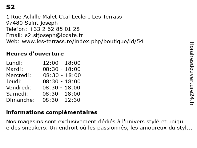 1 S2 (Distance: 13,27 km) - Canabady, 97452 Saint Pierre de La Réunion course à pied, mode, multisport, s2 2 S2 Sneakers Specialist (Distance: 13,68 km) 64 Rue des Bons Enfants, 97410 Saint-Pierre boutique, chaussures, marque, prêt à porter, s2, sneakers, specialist 5 S2 Sneakers Specialist (Distance: 53,36 km) - Centre Commercial Jumbo Score, 97438 Sainte-Marie de la Réunion boutique, chaussures, marque, prêt à porter, s2, sneakers, specialist 6 S2 (Distance: 56,49 km) 14 rue du Général de Gaulle, 97438 Sainte-Marie boutique, chaussure, chaussures, commerce, s2, vente |