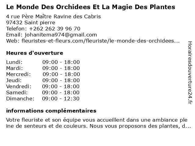 1 Le Monde des Orchidées & La Magie des Plantes (Distance: 0,02 km) 4 Rue du Père Maître, 97432 Saint-Pierre bouquet, composition, des, fleuriste, fleurs, la, le, magie, monde, orchidées, plantes 2 Le Monde des Orchidées et de la Décoration (Distance: 5,19 km) 159 Rue Augustin Archambaud, 97410 Saint-Pierre bouquet, composition, de, des, décoration, et, fleuriste, fleurs, la, le, monde, orchidées 3 Le Monde Des Perles (Distance: 6,77 km) 71B rue Caumont, 97410 Saint-Pierre atelier, bijoux, creation, des, le, monde, perles 4 Le Monde est Karré (Distance: 17,35 km) 54 rue Adrien Lagourgue, 97424 Saint-Leu alimentation, baguette, boulangerie, commerce, est, gâteaux, karré, le, monde, pain, pâtisserie, saint-leu 5 Objets Du Monde (Distance: 39,17 km) . Du Sacre Coeur, 97420 Le Port cafe, du, enfants.chaussures, lingerie, mode hemmes, mode homme, monde, objets, restaurant 6 Le Monde De La Glace (Distance: 39,71 km) 1 route du Coeur Saignant, 97420 Le Port cornet, de, gauffres, glace, glacier, la, le, monde, restauration, sorbet |