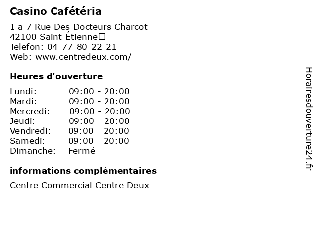 1 Les Comptoirs Casino (Distance: 0,03 km) 1-7 Rue des Docteurs Charcot, 42100 Saint-Étienne buffet, cafétéria, casino, comptoirs, dessert, les, plats, restauration 2 City Snack Cafétéria (Distance: 0,46 km) 50 Rue du Onze Novembre, 42100 Saint-Étienne alimentation, brasserie, cafeteria, cafétéria, city, parking, restaurant, snack, terrasse 3 Vival by Casino (Distance: 0,67 km) 21 Rue du 11 Novembre, 42000 Saint-Etienne by, casino, droguerie, d’hypermarchés, frais, fruits et légumes, hygiène, parfumerie et autres produits non alimentaires., surgelés, vival, épicerie 4 Casino Shop (Distance: 0,79 km) 15 Place Bellevue, 42100 Saint-Étienne alimentation, casino, fruits, legumes, shop, superette, épicerie 5 Vival by Casino (Distance: 1,23 km) - Cours Victor Hugo, 42000 Saint Etienne by, casino, droguerie, d’hypermarchés, frais, fruits et légumes, hygiène, parfumerie et autres produits non alimentaires., surgelés, vival, épicerie 6 Casino Supermarché (Distance: 1,33 km) 115 Cours Fauriel, 42100 Saint-Etienne alimentation, boisson, casino, supermarché, épicerie |