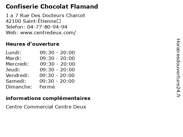 1 Flamand (Distance: 0,00 km) 1 à 7 Rue Des Docteurs Charcot, 42100 Saint-Étienne centre, commercial, deux, flamand 2 Chocolat Weiss (Distance: 1,69 km) 8 rue du Général Foy, 42000 Saint-Etienne ballotin, boutique, chocolat, confiserie, rocher, weiss 4 Chocolat des Princes (Distance: 1,78 km) 23 Rue de la République, 42000 Saint-Étienne chocolat, des, princes 5 Confiserie des Arcades - Maison Thomas (Distance: 2,03 km) 33 Arcades Jean Jaurès, 42000 Saint-Etienne arcades, bonbons, cafés, chocolats, confiserie, des, la, maison, thomas 6 Chocolat Des Princes (Distance: 6,17 km) 1220 Route de Bayard, 42580 La Tour-en-Jarez chocolat, des, princes |