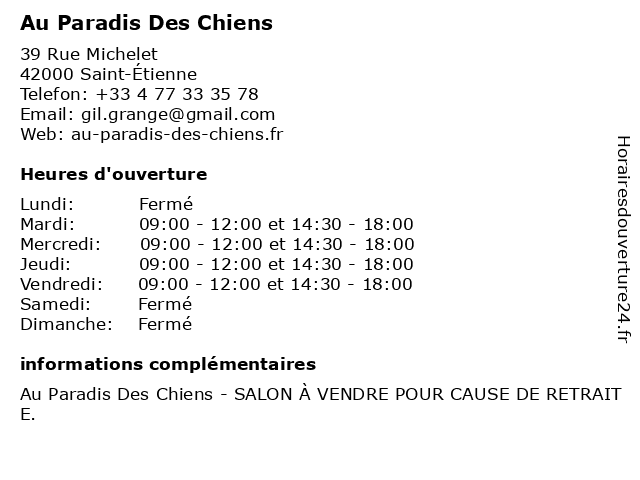 1 Nicolas Paradis - Ostéopathe (Distance: 14,24 km) 10 Avenue de Saint-Etienne, 42160 Andrézieux-Bouthéon nicolas, ostéo, ostéopathe, ostéopathes, paradis, soins 2 Reynaud Christine Toilettage (Distance: 0,67 km) 43 Rue de la République, 42000 Saint-Étienne canines, chiens, christine, domestiques, reynaud, toilettage, toiletteurs 3 La Ferme des Animaux (Distance: 0,94 km) 2 Place Jean Jaurès, 42000 Saint-Étienne animalerie, animaux, articles, chats, chiens, des, des animaux, ferme, la, la ferme, produits, saint-étienne 4 Beauty Can'in (Distance: 1,29 km) 19 Rue Grand Gonnet, 42000 Saint-Étienne beauty, can'in, canines, chiens, domestiques, toiletteurs 5 Bellevue Dog (Distance: 1,99 km) 7 Rue Robespierre, 42100 Saint-Étienne bellevue, canines, chiens, dog, domestiques, toiletteurs 6 Dog Form (Distance: 3,58 km) 154 Rue Bergson, 42000 Saint-Étienne canines, chiens, dog, domestiques, form, toiletteurs |