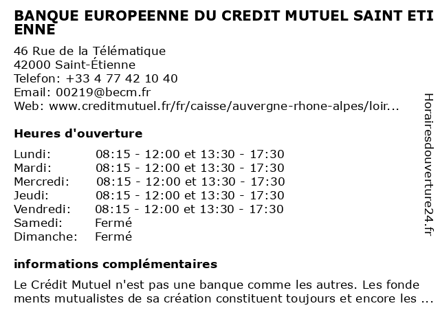 1 Crédit Mutuel (Distance: 0,00 km) 46 Rue De La Telematique, 42952 St Etienne compagnie de téléphone, crédit, mutuel, organisme d'assurance 2 Crédit Mutuel (Distance: 1,44 km) 3 Rue Bergson, 42000 St Etienne compagnie de téléphone, crédit, mutuel, organisme d'assurance 3 Crédit Mutuel (Distance: 1,45 km) 3 rue bergson, 42000 St Etienne argent, bancaire, credit, crédit, dépôt, mutuel, paiement, prêt 4 Crédit Mutuel (Distance: 1,46 km) 3 Rue Bergson, 42000 Saint-Etienne agence, assurance, bancaire, banque, crédit, mutuel 5 Crédit Mutuel (Distance: 1,70 km) 3 Place Massenet, 42000 St Etienne compagnie de téléphone, crédit, mutuel, organisme d'assurance 6 Crédit Mutuel (Distance: 1,70 km) 3 Place Massenet, 42000 Saint-Etienne agence, assurance, bancaire, banque, crédit, mutuel |