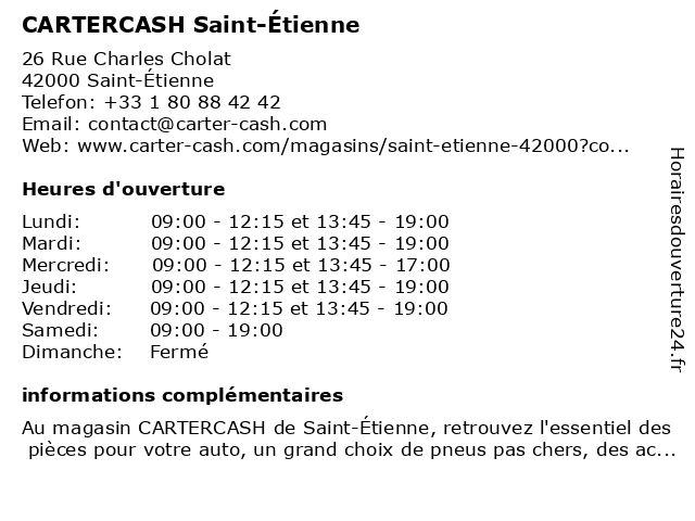 1 Carter-Cash (Distance: 0,02 km) 26 Rue Charles Cholat, 42000 Saint Etienne batteries, carter, cash, pneus, services 2 Easy Cash Saint-Etienne (Distance: 2,81 km) 2 Rue Ferrer, 42000 Saint-Étienne cash, easy, easycash saint etienne, easycash st etienne, etienne, saint 3 OR EN CASH Saint Etienne (Distance: 3,20 km) 27 Avenue de la Libération, 42000 Saint-Étienne cash, en, etienne, or, saint 4 Cash Converters Saint-Étienne (Distance: 3,30 km) 140 Rue de la Montat, 42000 Saint-Étienne bijoux occasion saint-etienne, cash, console occasion saint-etienne, converters, jeux vidéo occasion saint-etienne, magasin cash converters saint-etienne, rachat or saint-etienne, saint, smartphone occasion saint-etienne, électroménager occasion saint-etienne, étienne 5 CARTERCASH La Ricamarie (Distance: 6,02 km) Rue du Crêt de Mars, 42150 La Ricamarie cartercash, la, ricamarie 6 Carter-Cash (Distance: 7,07 km) - Rue Jean Moulin, 42150 La Ricamarie batteries, carter, cash, pneus, services |