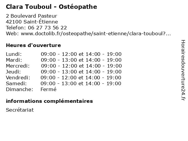 1 Clara Touboul - Ostéopathe (Distance: 2,12 km) 12 Boulevard de la Palle, 42100 Saint-Étienne actes et symptômes, clara, expertises, médecin, ostéopathe, ostéopathie du sport, touboul 2 Clara Touboul - Ostéopathe (Distance: 2,80 km) 8 Place Fourneyron, 42000 Saint-Étienne actes et symptômes, clara, expertises, médecin, ostéopathe, ostéopathie de la femme enceinte, touboul 3 Touboul Laurent (Distance: 2,39 km) 11 Rue Leon Nautin, 42000 Saint Etienne laurent, restaurants, touboul 4 Dr Clara Ruiz Guerrero - Radiologue (Distance: 7,78 km) 108 bis Avenue Albert Raimond, 42270 Saint-Priest-en-Jarez clara, consultation, docteur, dr, guerrero, med, médecin, radiologue, ruiz, traitement 5 Clara Randanne - Ostéopathe (Distance: 8,44 km) 8 Rue Lazare Carnot, 42350 La Talaudière clara, osteo, osteopathe, ostéopathe, randanne, sante, soins 6 Francois Chaudier - Ostéopathe (Distance: 1,36 km) 66 Rue Jean-Baptiste David, 42100 Saint-Étienne actes et symptômes, chaudier, expertises, francois, médecin, ostéopathe, ostéopathie crânienne |