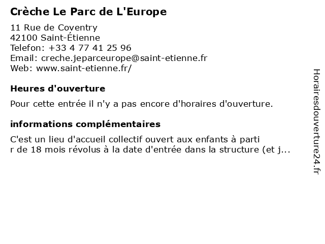 1 Hotel Mercure Saint Etienne Parc de L'Europe (Distance: 0,30 km) . Rue de Wuppertal, 42100 Saint-Étienne bar, de, etienne, hotel, l'europe, mercure, parc, restaurant, saint, service 2 Grande Pharmacie de l'Europe (Distance: 0,33 km) 86 Boulevard Alexandre de Fraissinette, 42100 Saint-Etienne conseil, de, grande, l'europe, médicaments, pharmacie, santé, soin 4 Crèche "Les frimousses stéphanoises" (Distance: 0,74 km) 39 Boulevard de la Palle, 42100 Saint-Étienne "les, caregivers houses, child care, crèche, family home, frimousses, home care, kindergartens, micro-nurseries, parental home, stéphanoises" 6 Crèche "La Source" (Distance: 1,74 km) 95 Rue Richelandière, 42100 Saint-Étienne "la, caregivers houses, child care, crèche, family home, home care, kindergartens, micro-nurseries, parental home, source" |