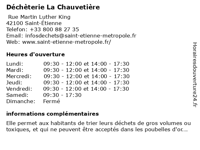 1 Déchèterie (Hiver) (Distance: 0,12 km) - Rue Martin Luther King, 42100 Saint-Etienne bennes, déchets, déchèterie, détritus, gravats, hiver 2 Déchèterie (Hiver) (Distance: 5,02 km) - rue Victor Grignard, 42000 Saint-Etienne bennes, déchets, déchèterie, détritus, gravats, hiver 3 Déchèterie (Hiver) (Distance: 6,75 km) - Rue du Moulin Picon, 42580 L'Étrat bennes, déchets, déchèterie, détritus, gravats, hiver 4 Déchèterie (Hiver) (Distance: 7,14 km) 511 Rue du Puits Lacroix, 42650 Saint-Jean-Bonnefonds bennes, déchets, déchèterie, détritus, gravats, hiver 5 Déchèterie (ETE du 15/05 au 15/09) (Distance: 7,16 km) - Riocreux, 42660 Saint-Genest-Malifaux 15/05, 15/09, au, du, déchèterie, ete, gravats, huiles usées, la réception des déchets et écocentres, les appareils électroménagers, les déchets verts, papier et carton en quantité 6 Déchèterie (Distance: 12,64 km) - lieu-dit Pré Furan, 42170 Saint-Just-Saint-Rambert benne, débarras, déchets, déchèterie, détritus |