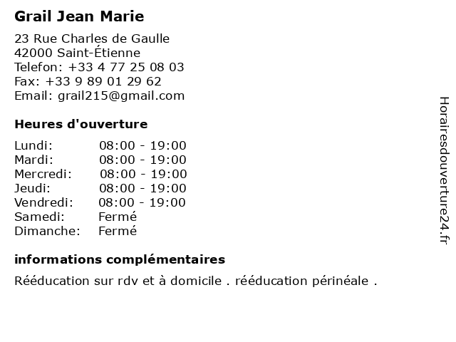 1 Claire Grail - Sage-femme (Distance: 9,23 km) 1 Rue de l'Abattoir, 42700 Firminy claire, du, femme, grail, maternité, périnée, rééducation, sage, uro-gynécologique 2 Chez Jean Marie (Distance: 16,26 km) Lieu Dit Chavanol, 42740 Doizieux chez, grail, jean, marie, restaurants 3 Grail Alain Auguste Joseph (Distance: 50,11 km) Etage 1Er, 69004 Lyon alain, auguste, bailleurs, biens, grail, immobiliers, joseph, nra 5 Marie Cariou - Naturopathe (Distance: 0,21 km) 1 Rue Bourgneuf, 42000 Saint-Étienne cariou, docteur, marie, naturopathe, sante, soins 6 Café Jean Jaurès (Distance: 0,22 km) 19 Place Jean Jaurès, 42000 Saint-Étienne café, cuisine, jaurès, jean, les boissons, restaurants, restauration |