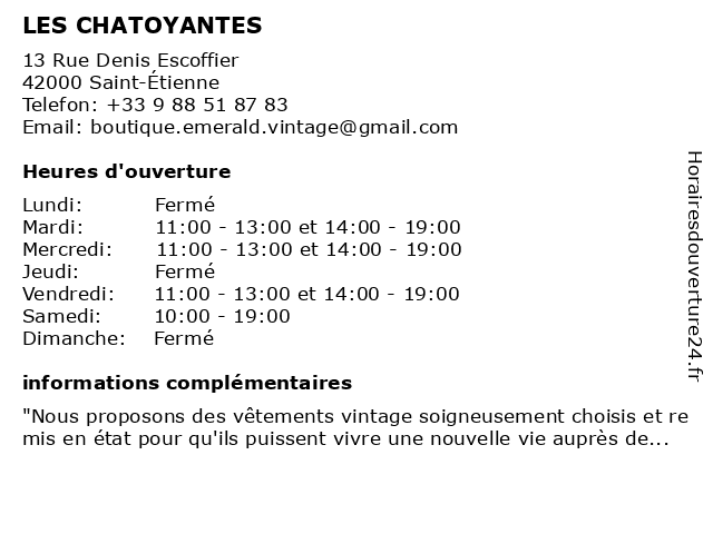 | Mercredi | 11:00-13:00 et 14:00-19:00 |