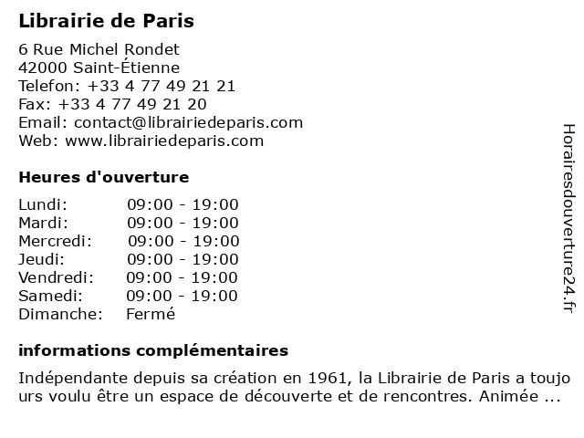 1 Librairie de Paris (Distance: 0,00 km) 6 Rue michel rondet, 42000 Saint etienne de, librairie, paris, saint etienne 2 Librairie les Croquelinottes (Distance: 0,03 km) 23 Rue de la resistance, 42000 Saint etienne croquelinottes, les, librairie, saint etienne 3 Draeger Paris -Tie Rack (Distance: 0,21 km) 9 Rue Alsace Lorraine, 42000 Saint-Etienne accessoires, chapeau, cravatte, draeger, maroquinerie, mode, paris, rack, tie, écharpes 4 Le Bistrot de paris (Distance: 0,28 km) 7 place Jean Jaurès, 42000 Saint-Etienne bistrot, de, le, paris, restaurant 5 LIBRAIRIE LES INTRUS (Distance: 0,29 km) 22 Rue Louis Braille, 42000 Saint-Étienne intrus, les, librairie 6 Librairie Lune et l'Autre (Distance: 0,37 km) 19 rue Pierre Berard, 42000 Saint-Etienne architecture, convivialité, design, echanges, et, l'autre, librairie, lune |