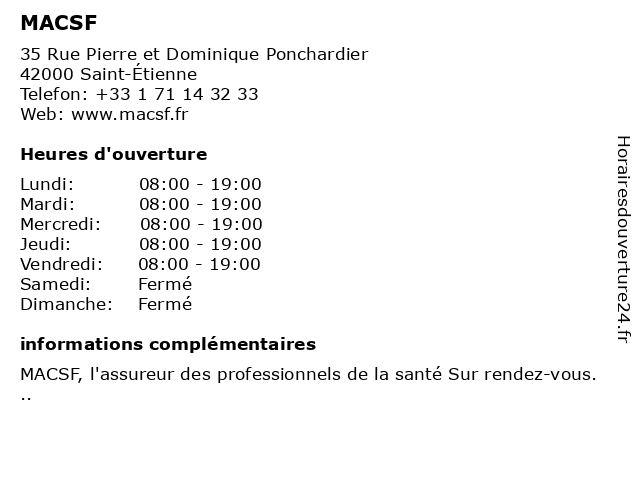 1 MACSF (Distance: 1,23 km) 26 Rue des Docteurs Charcot, 42014 Saint-Etienne assurance vie, assurances, macsf, services 2 MACSF (Distance: 51,17 km) 105 Rue Garibaldi, 69006 Lyon assurance, assurances, habitation, macsf, mutuelle, protection, prévoyance, santé 4 MACSF (Distance: 51,20 km) 60 Avenue Rockefeller, 69008 Lyon assurance vie, assurances, macsf, services |