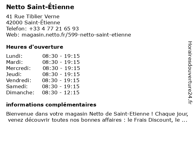 1 Netto Saint Etienne (Distance: 3,01 km) 7 Rue Marcel Feguide, 42100 Saint-Étienne etienne, netto, saint 2 Netto (Distance: 14,61 km) - Rond Point des Quatres Routes, 42340 Veauche achats de produits alimentaires, des prix bas, grands supermarchés, hard discount, netto, supermarchés 4 5 Netto Station Service (Distance: 19,14 km) - Le parc des Verchères, 42450 Sury-le-Comtal carburant, essences, gazole, netto, service, services, station 6 |