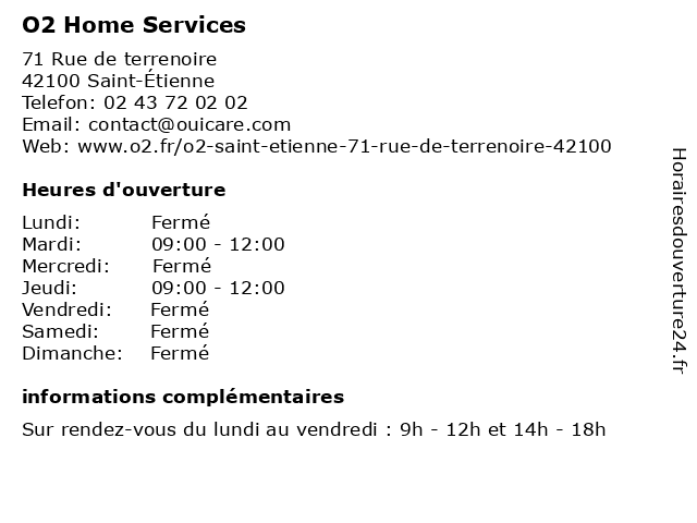 1 O2 Home Services (Distance: 0,03 km) 71 Rue de Terrenoire, 42100 Saint-Étienne domicile, home, o2, services 2 O2 Home Services (Distance: 5,62 km) 75 rue des Cimes, 42390 Villars aide aux seniors, garde d'enfants, handicap, home, incapacite temporaire, jardinage, menage repassage, o2, services 3 Home Sweet Home (Distance: 2,11 km) 16 rue Pierre Berard, 42000 Saint-Etienne accessoires, ameublement, art de la table, carterie, ceramique, coussins, home, maison, sweet 6 |