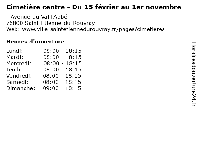 1 Cimetière centre - Du 2 novembre au 14 février (Distance: 0,00 km) - Avenue du Val l'Abbé, 76800 Saint-Étienne-du-Rouvray 14, arbre, au, centre, cimetiere, cimetière, du, espace vert, forêt, funeraire, février, jardin, loisirs, nature, novembre, parc, prairie, square 2 Cimetière du Madrillet - Du 15 février au 1er novembre (Distance: 1,73 km) - Rue de l'Orée du Rouvray, 76800 Saint-Étienne-du-Rouvray 15, 1er, arbre, au, cimetiere, cimetière, du, espace vert, forêt, funeraire, février, jardin, loisirs, madrillet, nature, novembre, parc, prairie, square 3 Cimetière du Madrillet - Du 2 novembre au 14 février (Distance: 1,73 km) - Rue de l'Orée du Rouvray, 76800 Saint-Étienne-du-Rouvray 14, arbre, au, cimetiere, cimetière, du, espace vert, forêt, funeraire, février, jardin, loisirs, madrillet, nature, novembre, parc, prairie, square 4 Cimetière Saint-Sever - Hiver (Distance: 4,47 km) - Boulevard Stanislas Girardin, 76140 Le Petit Quevilly cercueil, cimetiere, cimetière, deuil, hiver, mort, saint, sever 5 Phone+ 1er Centre De Réparation de GSM à Rouen (Distance: 5,81 km) 11 Place des Emmurées, 76100 Rouen 1er, centre, de, gsm, phone+, rouen, réparation 6 Maison des champs Pierre Corneille - du 1er octobre au 31 mars (Distance: 5,88 km) 502 rue Pierre Corneille, 76650 Petit-Couronne 1er, 31, au, champs, corneille, des, du, exposition, maison, mars, musée, octobre, pierre, visite |