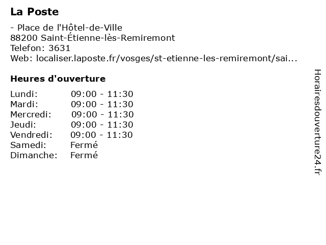 1 La Poste (Distance: 1,24 km) 41 Boulevard Thiers, 88200 Remiremont agence, assurance, banque, banque postale, bureau de poste, chronopost, colis, courrier, dps, expéditions internationales, la, point, postale, poste, relais, timbres, téléphonie, ups, western union 3 La Poste (Distance: 3,33 km) 7 Place de l'Eglise, 88200 Dommartin-lès-Remiremont agence, assurance, banque, banque postale, bureau de poste, chronopost, colis, courrier, dps, expéditions internationales, la, point, postale, poste, relais, timbres, téléphonie, ups, western union 4 La Poste (Distance: 3,59 km) 2 Place de la Gare, 88200 Saint-Nabord agence, colis, courriers, expédition, la, postale, poste, relais 5 La Poste (Distance: 4,98 km) 11 Rue du Centre, 88200 Vecoux agence, colis, courriers, expédition, la, postale, poste, relais 6 La Poste (Distance: 7,85 km) 16 Place Jue, 88220 Raon-aux-Bois agence, assurance, banque, banque postale, bureau de poste, chronopost, colis, courrier, dps, expéditions internationales, la, point, postale, poste, relais, timbres, téléphonie, ups, western union |