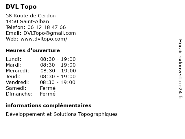 1 AAC Topo (Distance: 42,27 km) 5 Impasse des Geais, 38280 Villette-d'Anthon a.a.c, a.a.c.topo, aac, analyser, arpenter, concevoir, topo, villette-d'anthon 3 Julien Terrier - Pédicure-podologue (Distance: 11,83 km) 51 Route de Montagnat, 01250 Tossiat cheville, julien, orteil, pied, podologue, pédicure, terrier 4 Dr Julien Martin - Médecin généraliste (Distance: 13,95 km) 36 Allée Hugon, 01250 Ceyzériat consultation, docteur, dr, généraliste, julien, martin, med, médecin, médecine, secrétariat, traitement 5 Julien Guiffray Toitures (Distance: 30,38 km) 12 Rue du Bugey, 01470 Serrières-de-Briord charpentier, guiffray, julien, julien guiffray, serrières-de-briord, toitures 6 L'Auberge du Moulin de Saint-Julien - Restaurant (du 5 mai au dernier week-end de septembre) (Distance: 49,03 km) 39 Route de Flurieux, 01140 Saint-Didier-sur-Chalaronne au, de, dernier, du, end, julien, l'auberge, mai, moulin, restaurant, restauration, saint, septembre, week |