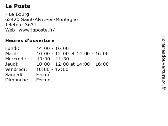 1 La Poste (Distance: 0,00 km) - Le Bourg, 63420 Anzat-le-Luguet agence, assurance, banque, banque postale, bureau de poste, chronopost, colis, courrier, dps, expéditions internationales, la, point, postale, poste, relais, timbres, téléphonie, ups, western union 2 La Poste (Distance: 7,49 km) - Le Bourg, 63420 Saint-Alyre-és-Montagne agence, assurance, banque, banque postale, bureau de poste, chronopost, colis, courrier, dps, expéditions internationales, la, point, postale, poste, relais, timbres, téléphonie, ups, western union 3 La Poste (Distance: 9,92 km) Le Bourg, 15500 Auriac-l'Église agence, assurance, banque, banque postale, bureau de poste, chronopost, colis, courrier, dps, expéditions internationales, la, point, postale, poste, relais, timbres, téléphonie, ups, western union 4 La Poste (Distance: 13,04 km) - place Charles de Gaulle, 15500 Molompize agence, assurance, banque, banque postale, bureau de poste, chronopost, colis, courrier, dps, expéditions internationales, la, point, postale, poste, relais, timbres, téléphonie, ups, western union 5 La Poste (Distance: 14,23 km) 19 rue des Forgerons, 15160 Allanche agence, assurance, banque, banque postale, bureau de poste, chronopost, colis, courrier, dps, expéditions internationales, la, point, postale, poste, relais, timbres, téléphonie, ups, western union 6 La Poste (Distance: 14,46 km) - Le Bourg, 63850 Espinchal agence, assurance, banque, banque postale, bureau de poste, chronopost, colis, courrier, dps, expéditions internationales, la, point, postale, poste, relais, timbres, téléphonie, ups, western union |