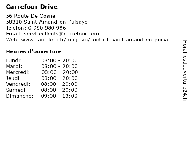 1 Carrefour Drive (Distance: 19,59 km) - Zac Champ De La Dispute, 58200 Cosne-Cours-sur-Loire alimentaire, carrefour, courses, drive, en ligne, magasin 2 Carrefour Contact (Distance: 0,00 km) 56 Route de Cosne, 58310 Saint-Amand-en-Puisaye alimentaire, alimentation, carrefour, contact, courses, distributeur, hypermarché, supermarché, épicerie 3 Carrefour Station Service (Distance: 0,28 km) - Route de Cosne, 58310 Saint-Amand-en-Puisaye carburant, carrefour, essences, gazole, service, services, station 4 U Express et Drive (Distance: 13,92 km) Route de Ouanne, 89520 Saint-Sauveur-en-Puisaye drive, et, express 5 Locavor - Drive Fermier (Distance: 16,02 km) - Route de Belleville, 18240 Sury-près-Léré alimentation, drive, fermier, fermiers, local, locavor, marché, producteurs, produits 6 Carrefour Market (Distance: 16,72 km) 58 Avenue du Marechal Leclerc, 58200 Cosne-Cours-sur-Loire alimentation, carrefour, magasin discount, market, supermarché  |