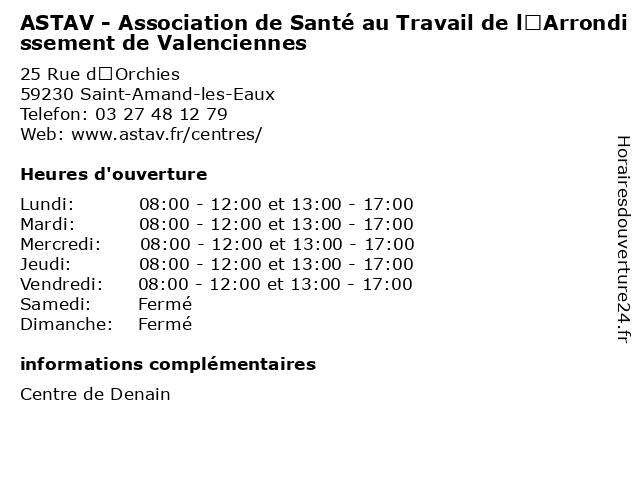 1 ASTAV - Association de Santé au Travail de l’Arrondissement de Valenciennes (Distance: 12,72 km) 1 Avenue de l’Europe, 59880 Saint-Saulve association, astav, au, centre, de, famille, l’arrondissement, médical, santé, travail, valenciennes 2 ASTAV - Association de Santé au Travail de l’Arrondissement de Valenciennes (Distance: 14,61 km) 16 Boulevard Charles de Gaulle, 59220 Denain association, astav, au, centre, de, famille, l’arrondissement, médical, santé, travail, valenciennes 3 Centre de Santé Dentaire Mutualiste (Distance: 0,12 km) 32 Rue Davaine, 59230 Saint Amand les Eaux centre, de, dentaire, docteur, medecins, mutualiste, sante, santé 4 Espace Santé du Moulin Blanc (secrétariat ) (Distance: 1,85 km) 116 Rue de la Wenberghe, 59230 Saint-Amand-les-Eaux blanc, consultation, docteur, du, espace, moulin, médecins, santé, secrétariat 5 Le Five Valenciennes (Distance: 7,78 km) - Rue Michel Chasles, 59494 Petite-Forêt five, foot, le, le five, petite-forêt, salle, sport, valenciennes 6 Opticien VALENCIENNES - PETITE-FORÊT Optical Center (Distance: 8,10 km) Rue Anatole France, 59494 Petite-Forêt center, forêt, optical, opticien, petite, valenciennes |