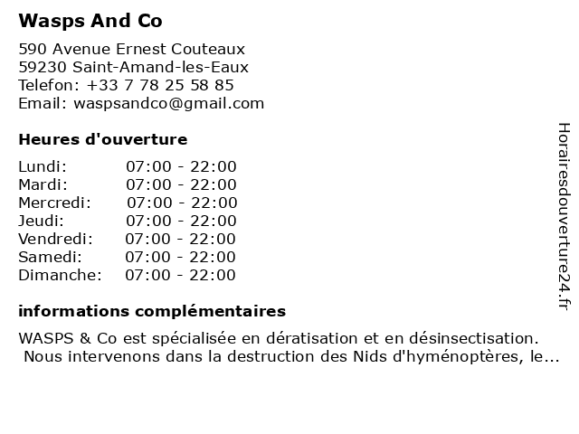 | 1 Wasps & Co (Distance: 0,01 km) 590 Avenue Ernest Couteaux, 59230 Saint-Amand-les-Eaux co, dératisation, extermination, nuisibles, services, wasps 2 Tom & Co (Distance: 7,63 km) - Route Nationale 45, 59494 Petite Foret animaux, animaux de compagnie, co, services, tom 3 Columbus Café & Co (Distance: 10,68 km) 55 places d'Armes, 59300 Valenciennes bar, boissons, café, cafés, chaudes, chocolat, co, coffee-shop, columbus, expressos, muffins, restaurant, restauration, sandwichs, thé 4 Clés & Co (Distance: 10,92 km) . Route Nationale 45, 59494 Petite Forêt cafe, chaussures, clés, co, enfants, homme, hypermarche, mode femme, restaurant, service 5 Tom & Co (Distance: 10,92 km) . Route Nationale 45, 59494 Petite Forêt cafe, chaussures, co, enfants, homme, hypermarche, mode femme, restaurant, service, tom 6 Tom & Co (Distance: 11,29 km) 45 Route Nationale, 59494 Petit Foret beaute, cafe, co, femme, homme, maison, mode, sport, tom |