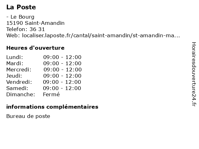 1 La Poste (Distance: 4,99 km) 1 Place Marie Aimée Méraville, 15190 Condat agence, colis, courriers, expédition, la, postale, poste, relais 3 La Poste (Distance: 7,18 km) - Le Bourg, 15400 Menet agence, colis, courrier, expédition, la, postale, poste 4 La Poste (Distance: 7,19 km) Le Bourg, 15400 Saint-Étienne-de-Chomeil agence, assurance, banque, banque postale, bureau de poste, chronopost, colis, courrier, dps, expéditions internationales, la, point, postale, poste, relais, timbres, téléphonie, ups, western union 5 La Poste (Distance: 7,49 km) - Le Bourg, 15400 Menet agence, assurance, banque, banque postale, bureau de poste, chronopost, colis, courrier, dps, expéditions internationales, la, point, postale, poste, relais, timbres, téléphonie, ups, western union 6 |