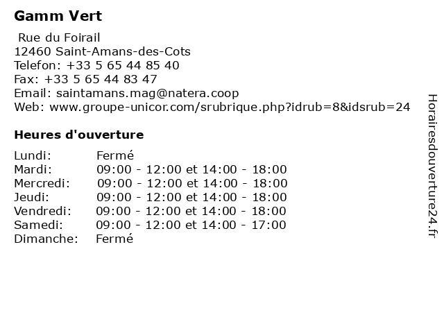 1 GAMM VERT (Distance: 0,03 km) Rue du Foirail, 12460 Saint-Amans-des-Cots animalerie, animaux, gamm, jardinage, plantes, potager, produits locaux, vert 3 Gamm Vert (Distance: 18,32 km) n/a Route de Villecomtal, 65190 Bordes automobile, centre auto, dépannage, entretien, gamm, garage, nettoyage, pièces techniques, pneus, réparation, transport, tuning et accessoires, vert, équipement intérieur / extérieur auto 5 GAMM VERT (Distance: 19,08 km) Zone d'Activité de la Bouysse, 12500 Espalion animalerie, animaux, gamm, jardinage, plantes, potager, produits locaux, vert 6 Gamm Vert - Mur de barrez (Distance: 15,18 km) 863 Route de Lacroix Barrez, 12600 Taussac barrez, de, gamm, mur, vert |